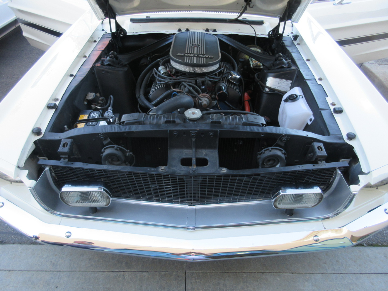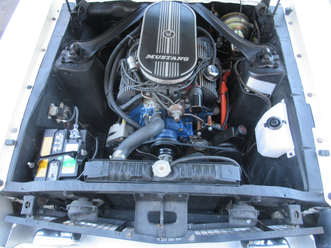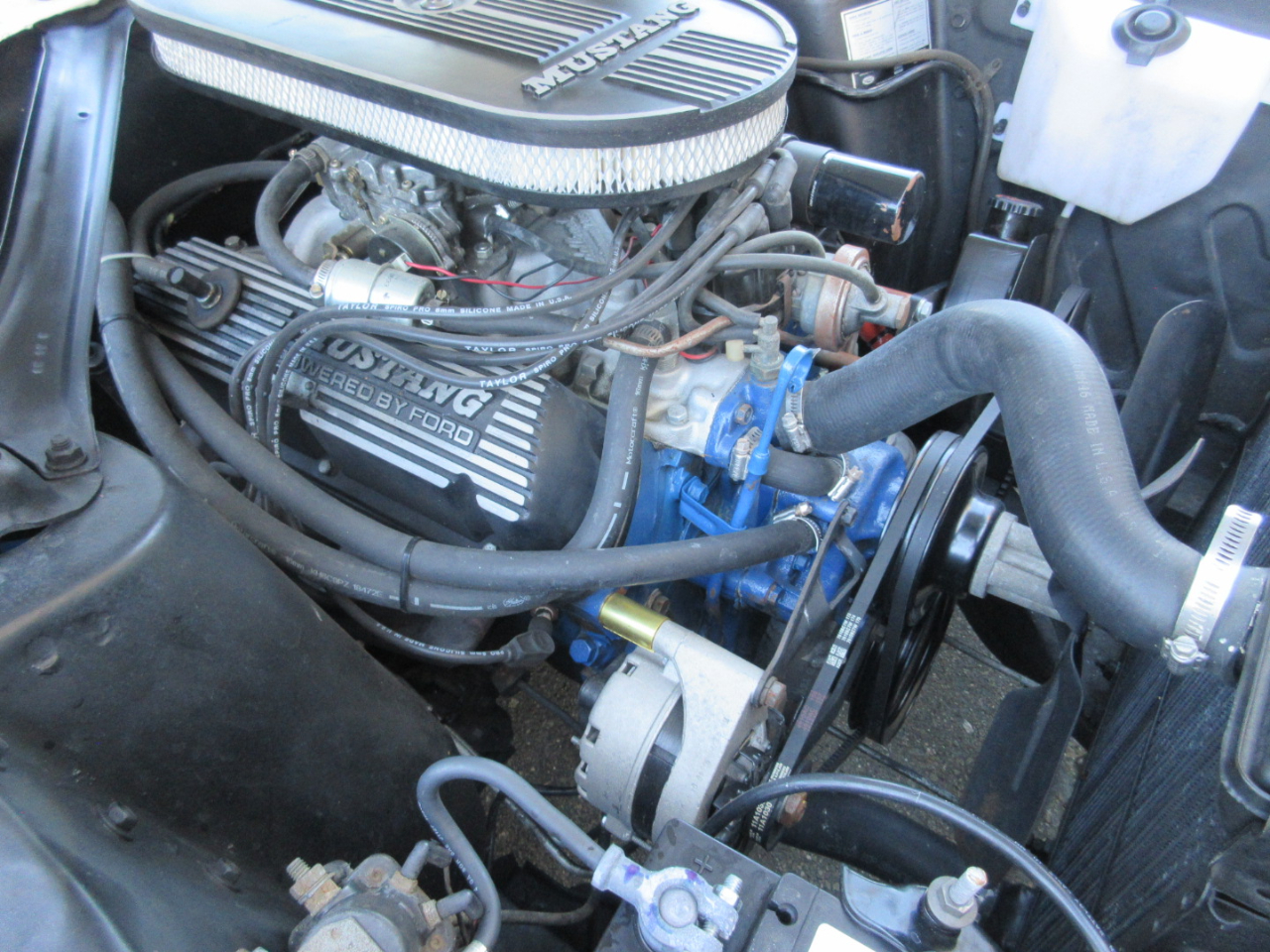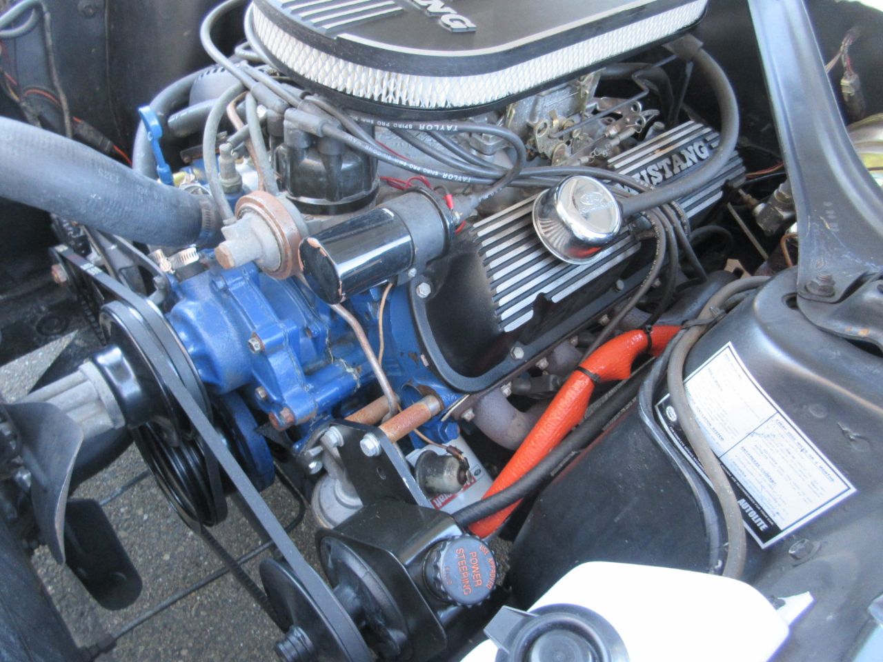 The original 289 ci v8 was completely rebuilt including a three angle valve job on the heads, more aggressive cam, Edelbrock intake and carburetor, pistons bored to .030, new alternator, voltage regulator, mid length headers and new radiator.  Other upgrades include a 4 speed AOD transmission from an early 90’s mustang with four speed overdrive, front power disc brake conversion, Petronix ignition, Borgeson power steering conversion, Shelby drop front springs, shocks and new control arms and tie rods.  The rear end was rebuilt with a 350 gear set.